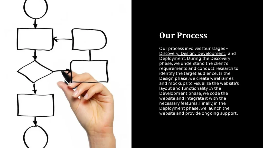 OurProcess Ourprocessinvolvesfourstages- Discovery, Design, Development, and Deployment.DuringtheDiscovery phase,weunderstandtheclient's requirementsandconductresearchto identifythetargetaudience.Inthe Designphase,wecreatewireframes andmockupstovisualizethewebsite's layoutandfunctionality.Inthe Developmentphase,wecodethe websiteandintegrateitwiththe necessaryfeatures.Finally,inthe Deploymentphase,welaunchthe websiteandprovideongoingsupport.