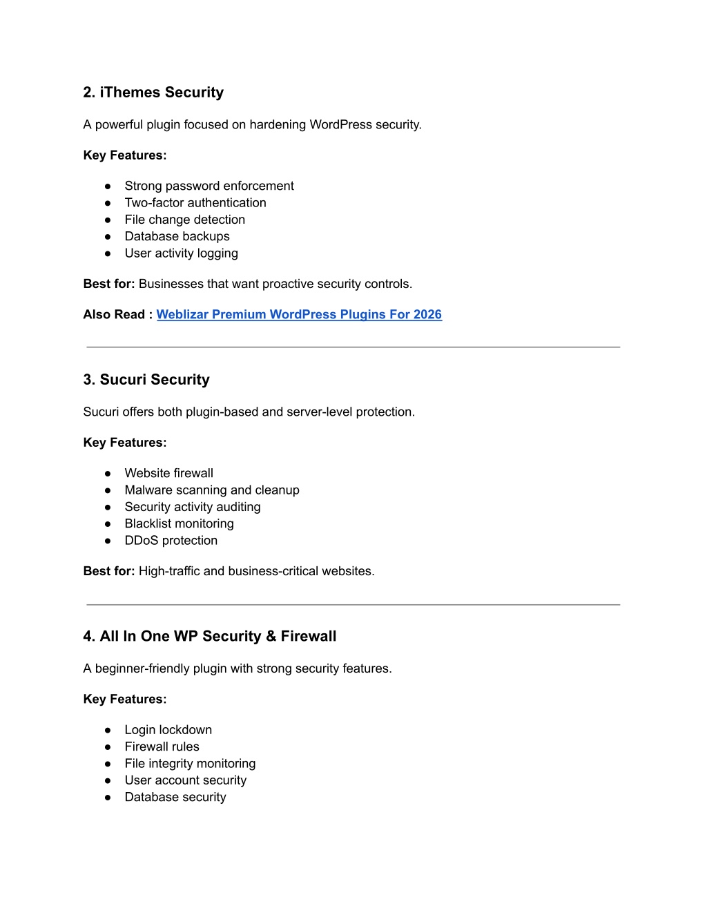 2. iThemes Security A powerful plugin focused on hardening WordPress security. Key Features: ● Strong password enforcement ● Two-factor authentication ● File change detection ● Database backups ● User activity logging Best for: Businesses that want proactive security controls. Also Read : Weblizar Premium WordPress Plugins For 2026 3. Sucuri Security Sucuri offers both plugin-based and server-level protection. Key Features: ● Website firewall ● Malware scanning and cleanup ● Security activity auditing ● Blacklist monitoring ● DDoS protection Best for: High-traffic and business-critical websites. 4. All In One WP Security & Firewall A beginner-friendly plugin with strong security features. Key Features: ● Login lockdown ● Firewall rules ● File integrity monitoring ● User account security ● Database security