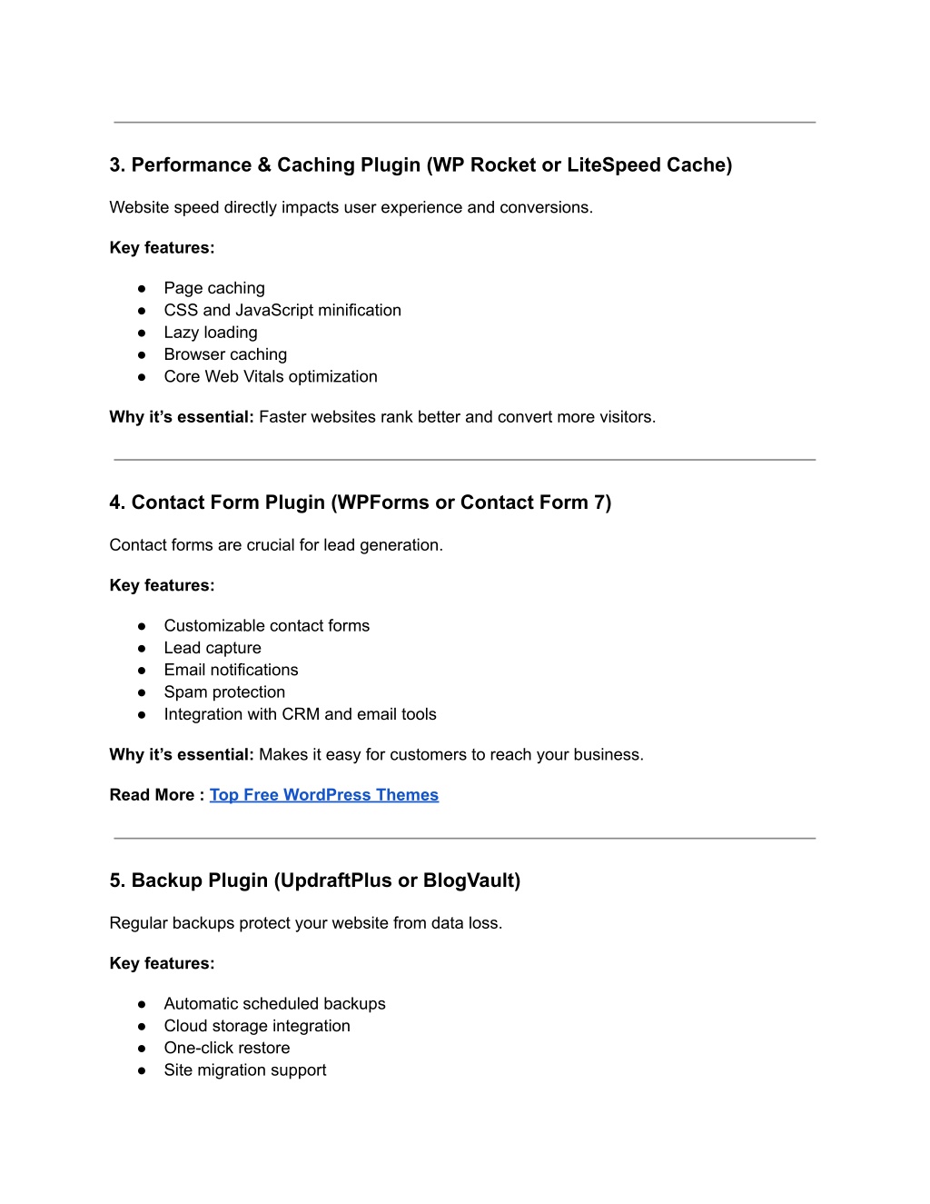 3. Performance & Caching Plugin (WP Rocket or LiteSpeed Cache) Website speed directly impacts user experience and conversions. Key features: ● Page caching ● CSS and JavaScript minification ● Lazy loading ● Browser caching ● Core Web Vitals optimization Why it’s essential: Faster websites rank better and convert more visitors. 4. Contact Form Plugin (WPForms or Contact Form 7) Contact forms are crucial for lead generation. Key features: ● Customizable contact forms ● Lead capture ● Email notifications ● Spam protection ● Integration with CRM and email tools Why it’s essential: Makes it easy for customers to reach your business. Read More : Top Free WordPress Themes 5. Backup Plugin (UpdraftPlus or BlogVault) Regular backups protect your website from data loss. Key features: ● Automatic scheduled backups ● Cloud storage integration ● One-click restore ● Site migration support