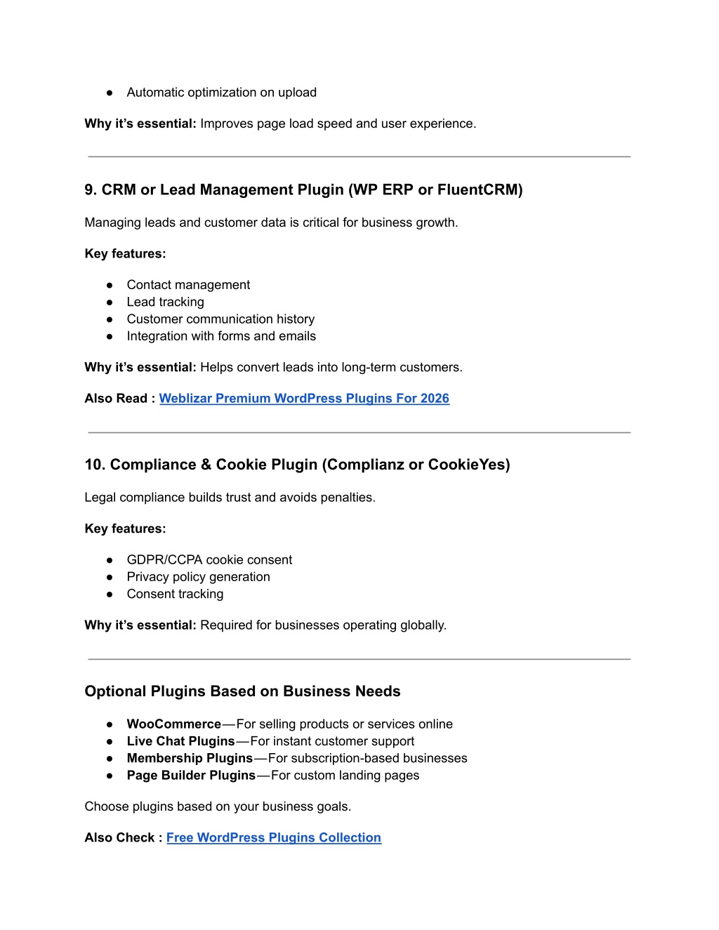 ● Automatic optimization on upload Why it’s essential: Improves page load speed and user experience. 9. CRM or Lead Management Plugin (WP ERP or FluentCRM) Managing leads and customer data is critical for business growth. Key features: ● Contact management ● Lead tracking ● Customer communication history ● Integration with forms and emails Why it’s essential: Helps convert leads into long-term customers. Also Read : Weblizar Premium WordPress Plugins For 2026 10. Compliance & Cookie Plugin (Complianz or CookieYes) Legal compliance builds trust and avoids penalties. Key features: ● GDPR/CCPA cookie consent ● Privacy policy generation ● Consent tracking Why it’s essential: Required for businesses operating globally. Optional Plugins Based on Business Needs ● WooCommerce — For selling products or services online ● Live Chat Plugins — For instant customer support ● Membership Plugins — For subscription-based businesses ● Page Builder Plugins — For custom landing pages Choose plugins based on your business goals. Also Check : Free WordPress Plugins Collection