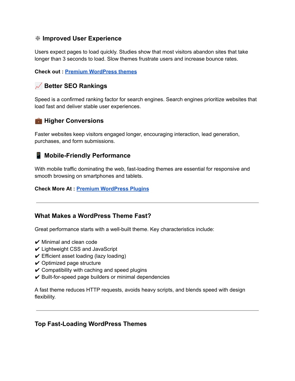 ❇ Improved User Experience Users expect pages to load quickly. Studies show that most visitors abandon sites that take longer than 3 seconds to load. Slow themes frustrate users and increase bounce rates. Check out : Premium WordPress themes ? Better SEO Rankings Speed is a confirmed ranking factor for search engines. Search engines prioritize websites that load fast and deliver stable user experiences. ? Higher Conversions Faster websites keep visitors engaged longer, encouraging interaction, lead generation, purchases, and form submissions. ? Mobile-Friendly Performance With mobile traffic dominating the web, fast-loading themes are essential for responsive and smooth browsing on smartphones and tablets. Check More At : Premium WordPress Plugins What Makes a WordPress Theme Fast? Great performance starts with a well-built theme. Key characteristics include: ✔ Minimal and clean code ✔ Lightweight CSS and JavaScript ✔ Efficient asset loading (lazy loading) ✔ Optimized page structure ✔ Compatibility with caching and speed plugins ✔ Built-for-speed page builders or minimal dependencies A fast theme reduces HTTP requests, avoids heavy scripts, and blends speed with design flexibility. Top Fast-Loading WordPress Themes