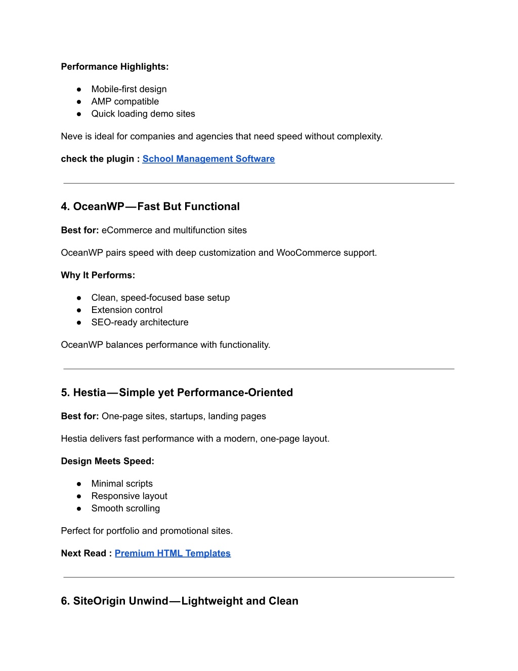 Performance Highlights: ● Mobile-first design ● AMP compatible ● Quick loading demo sites Neve is ideal for companies and agencies that need speed without complexity. check the plugin : School Management Software 4. OceanWP — Fast But Functional Best for: eCommerce and multifunction sites OceanWP pairs speed with deep customization and WooCommerce support. Why It Performs: ● Clean, speed-focused base setup ● Extension control ● SEO-ready architecture OceanWP balances performance with functionality. 5. Hestia — Simple yet Performance-Oriented Best for: One-page sites, startups, landing pages Hestia delivers fast performance with a modern, one-page layout. Design Meets Speed: ● Minimal scripts ● Responsive layout ● Smooth scrolling Perfect for portfolio and promotional sites. Next Read : Premium HTML Templates 6. SiteOrigin Unwind — Lightweight and Clean