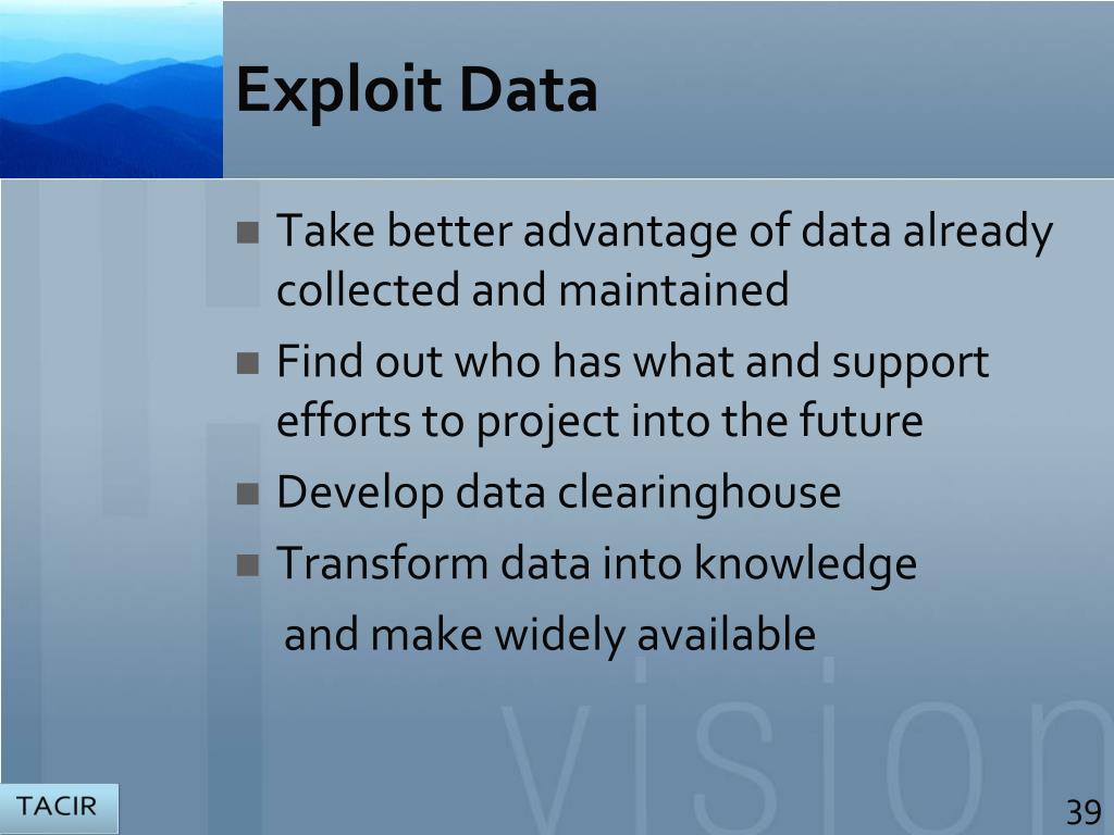 Exploit Data Take better advantage of data already collected and maintained Find out who has what and support efforts to project into the future Develop data clearinghouse Transform data into knowledge and make widely available