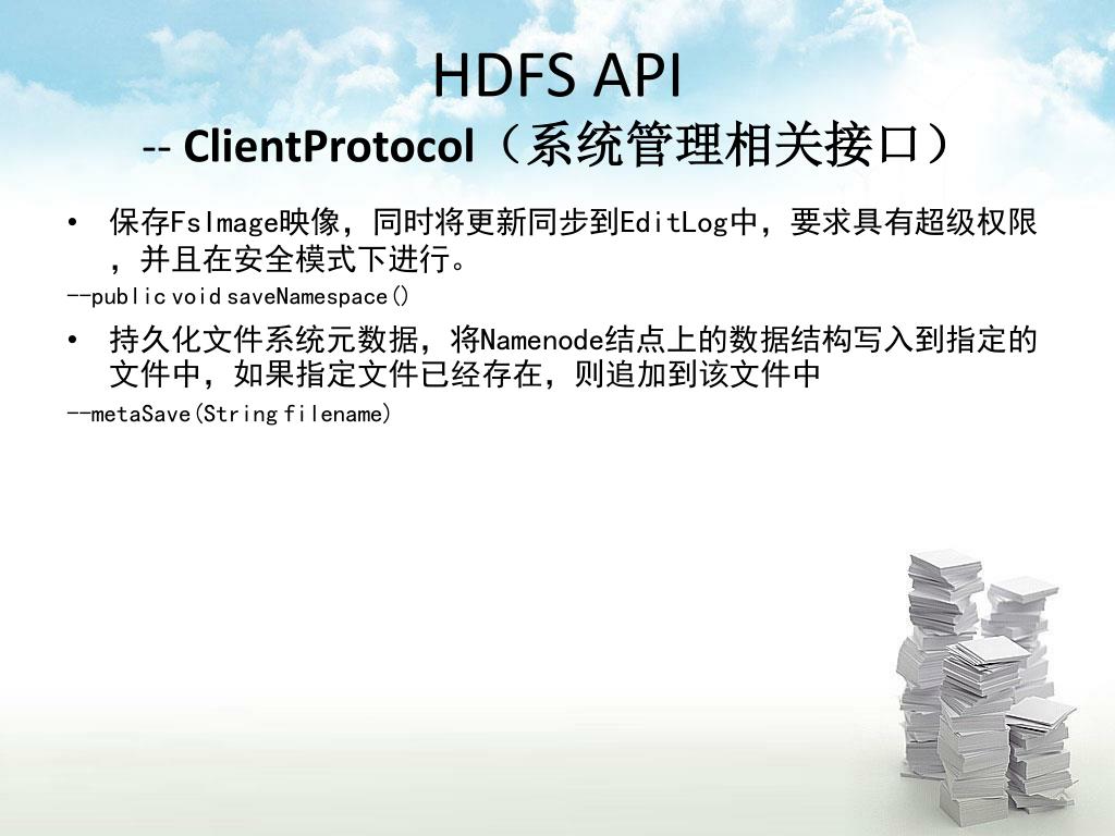 HDFS API-- ClientProtocol(系统管理相关接口) • 保存FsImage映像,同时将更新同步到EditLog中,要求具有超级权限,并且在安全模式下进行。 --public void saveNamespace() • 持久化文件系统元数据,将Namenode结点上的数据结构写入到指定的文件中,如果指定文件已经存在,则追加到该文件中 --metaSave(String filename)