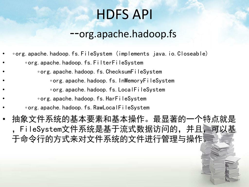 HDFS API--org.apache.hadoop.fs • ◦org.apache.hadoop.fs.FileSystem (implements java.io.Closeable) • ◦org.apache.hadoop.fs.FilterFileSystem • ◦org.apache.hadoop.fs.ChecksumFileSystem • ◦org.apache.hadoop.fs.InMemoryFileSystem • ◦org.apache.hadoop.fs.LocalFileSystem • ◦org.apache.hadoop.fs.HarFileSystem • ◦org.apache.hadoop.fs.RawLocalFileSystem • 抽象文件系统的基本要素和基本操作。最显著的一个特点就是,FileSystem文件系统是基于流式数据访问的,并且,可以基于命令行的方式来对文件系统的文件进行管理与操作。
