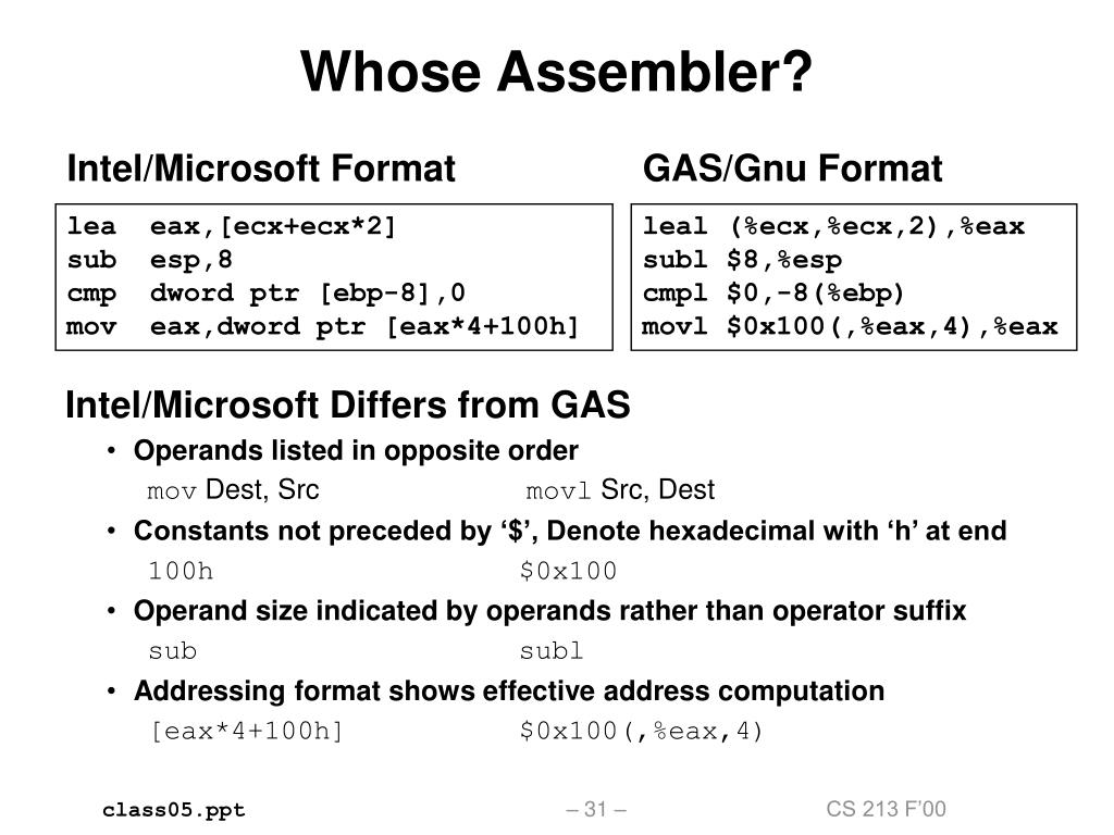 Whose Assembler? • Intel/Microsoft Differs from GAS • Operands listed in opposite order mov Dest, Src movl Src, Dest • Constants not preceded by ‘$’, Denote hexadecimal with ‘h’ at end 100h $0x100 • Operand size indicated by operands rather than operator suffix sub subl • Addressing format shows effective address computation [eax*4+100h] $0x100(,%eax,4) Intel/Microsoft Format GAS/Gnu Format lea eax,[ecx+ecx*2] sub esp,8 cmp dword ptr [ebp-8],0 mov eax,dword ptr [eax*4+100h] leal (%ecx,%ecx,2),%eax subl $8,%esp cmpl $0,-8(%ebp) movl $0x100(,%eax,4),%eax