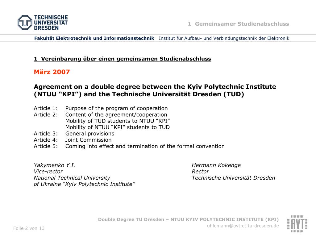 1 Gemeinsamer Studienabschluss 1 Vereinbarung über einen gemeinsamen Studienabschluss März 2007 Agreement on a double degree between the Kyiv Polytechnic Institute (NTUU “KPI”) and the Technische Universität Dresden (TUD) Article 1: Purpose of the program of cooperation Article 2: Content of the agreement/cooperation Mobility of TUD students to NTUU “KPI” Mobility of NTUU “KPI” students to TUD Article 3: General provisions Article 4: Joint Commission Article 5: Coming into effect and termination of the formal convention Yakymenko Y.I. Hermann Kokenge Vice-rector RectorNational Technical University Technische Universität Dresden of Ukraine “Kyiv Polytechnic Institute”