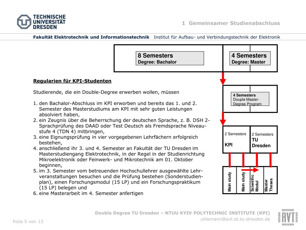 4 Masterarbeit • 4. Masterarbeit (Deutsch oder Englisch) • - Dauer der Bearbeitung: 6 Monate • - Themenstellung durch IAVT aus den aktuellen Forschungsprojekten • - Vorverteidigung am IAVT, finale Verteidigung am KPI • - gemeinsame Masterurkunde von NTUU Kiev und von TU Dresden