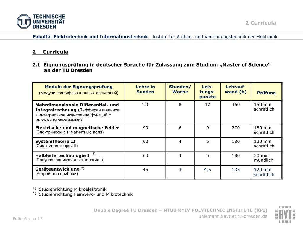 2 Curricula 2 Curricula 2.1 Eignungsprüfung in deutscher Sprache für Zulassung zum Studium „Master of Science“ an der TU Dresden 1) Studienrichtung Mikroelektronik 2) Studienrichtung Feinwerk- und Mikrotechnik