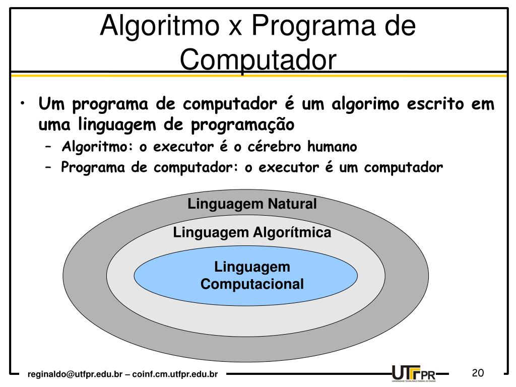 Linguagem Natural Linguagem Algorítmica Linguagem Computacional Algoritmo x Programa de Computador • Um programa de computador é um algorimo escrito em uma linguagem de programação • Algoritmo: o executor é o cérebro humano • Programa de computador: o executor é um computador