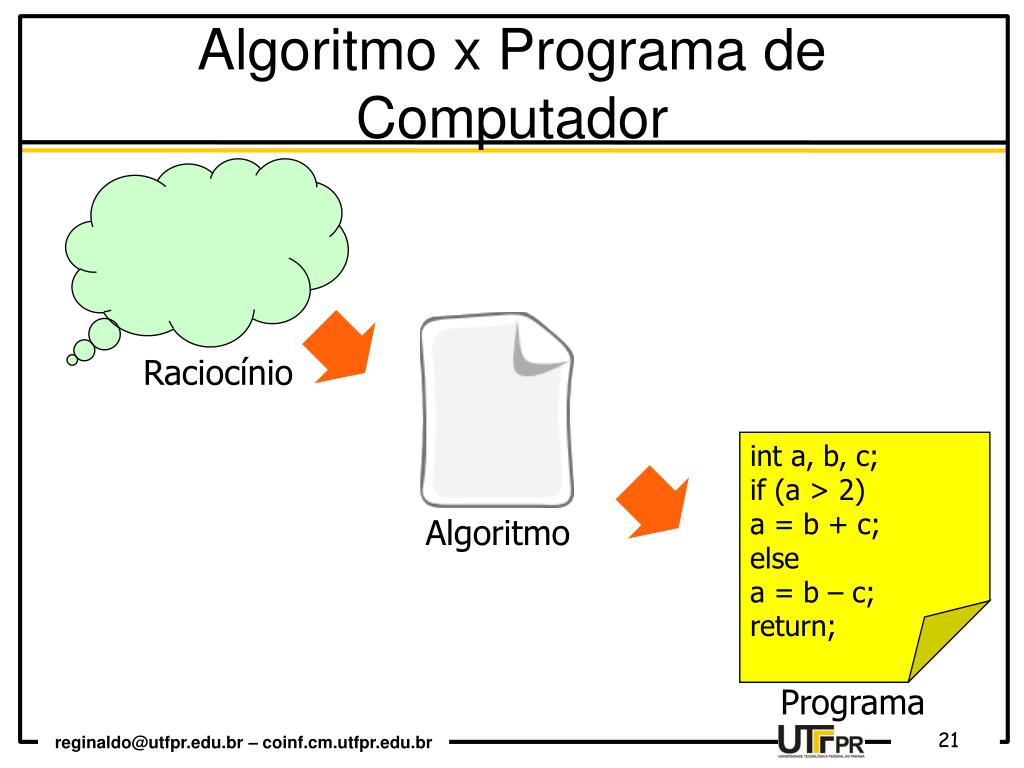Algoritmo x Programa de Computador Raciocínio int a, b, c; if (a > 2) a = b + c; else a = b – c; return; Algoritmo Programa