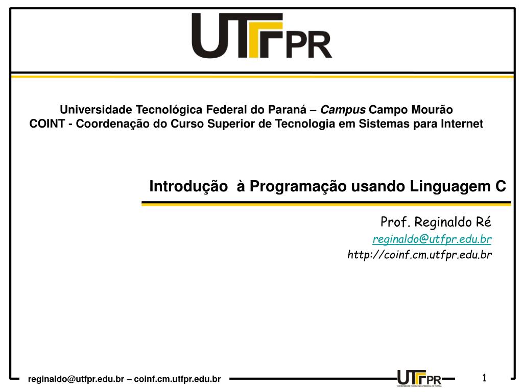 Prof. Reginaldo Ré reginaldo@utfpr.edu.br http://coinf.cm.utfpr.edu.br. Universidade Tecnológica Federal do Paraná – Campus Campo Mourão COINT - Coordenação do Curso Superior de Tecnologia em Sistemas para Internet. Introdução à Programação usando Linguagem C.