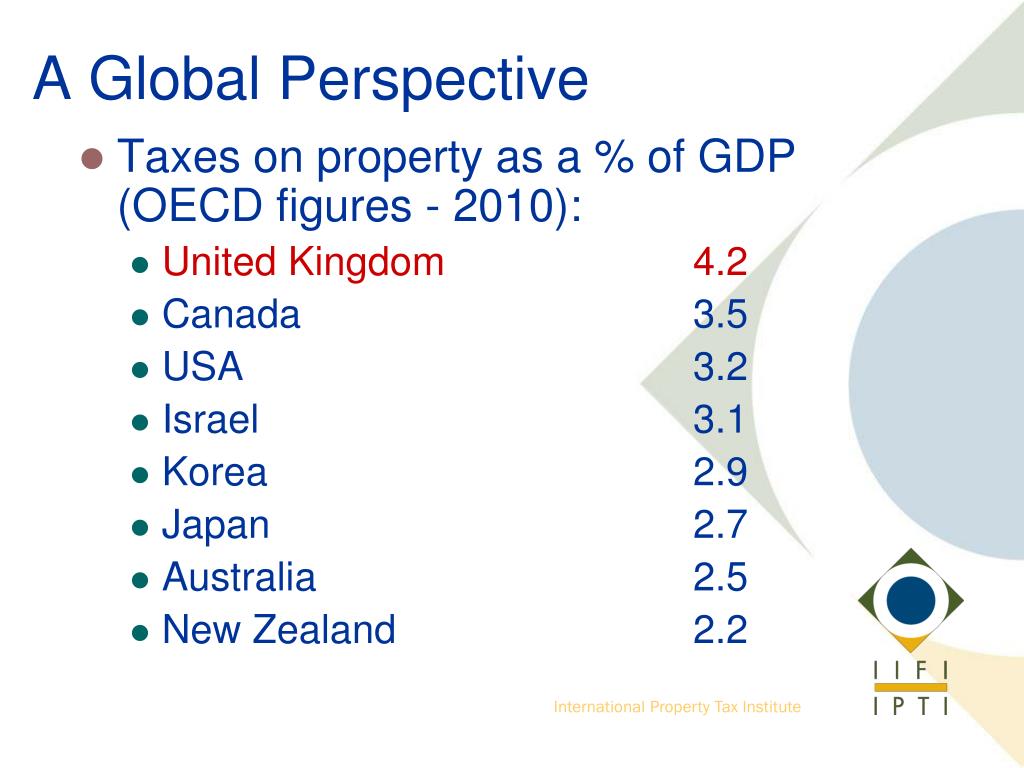 A Global Perspective Taxes on property as a % of GDP (OECD figures - 2010): United Kingdom 4.2 Canada 3.5 USA 3.2 Israel 3.1 Korea 2.9 Japan 2.7 Australia 2.5 New Zealand 2.2