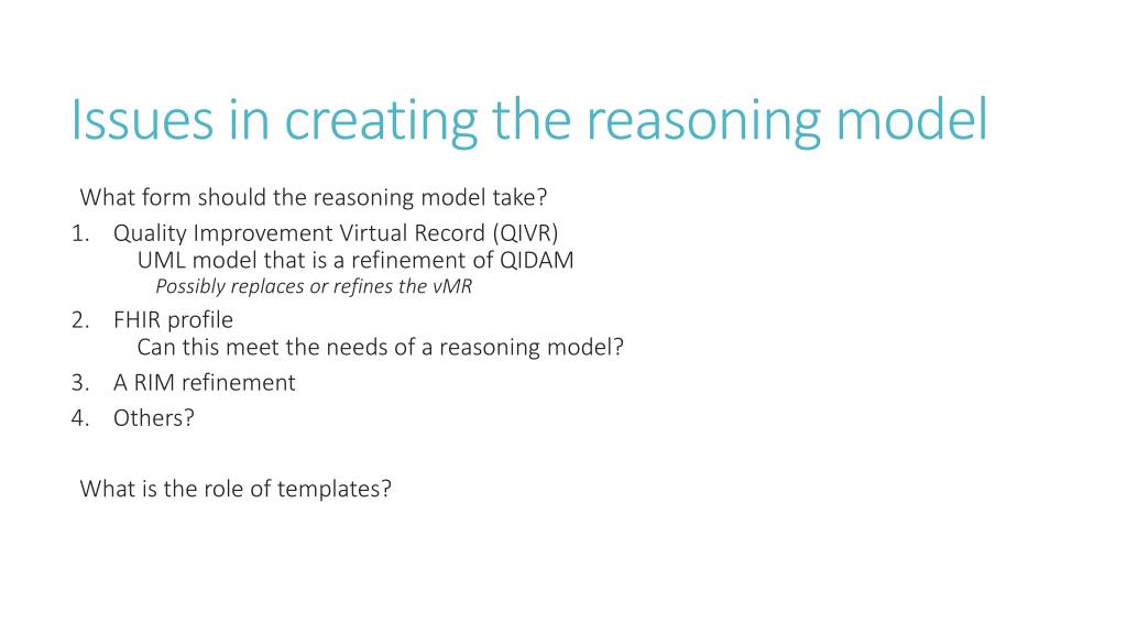 Issues in creating the reasoning model • What form should the reasoning model take? • Quality Improvement Virtual Record (QIVR) • UML model that is a refinement of QIDAM • Possibly replaces or refines the vMR • FHIR profile • Can this meet the needs of a reasoning model? • A RIM refinement • Others? • What is the role of templates?