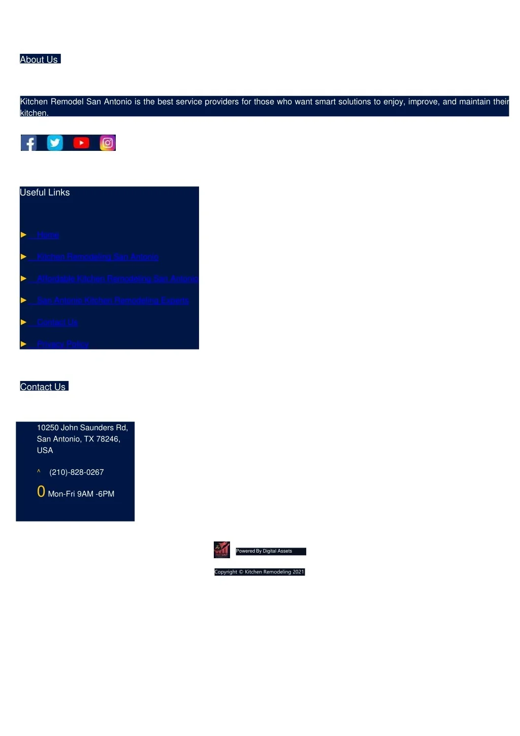 About Us Kitchen Remodel San Antonio is the best service providers for those who want smart solutions to enjoy, improve, and maintain their kitchen. Useful Links ►Home ►Kitchen Remodeling San Antonio ►Affordable Kitchen Remodeling San Antonio ►San Antonio Kitchen Remodeling Experts ►Contact Us ►Privacy Policy Contact Us 10250 John Saunders Rd, San Antonio, TX 78246, USA ^ (210)-828-0267 0Mon-Fri 9AM -6PM Powered By Digital Assets Copyright © Kitchen Remodeling 2021