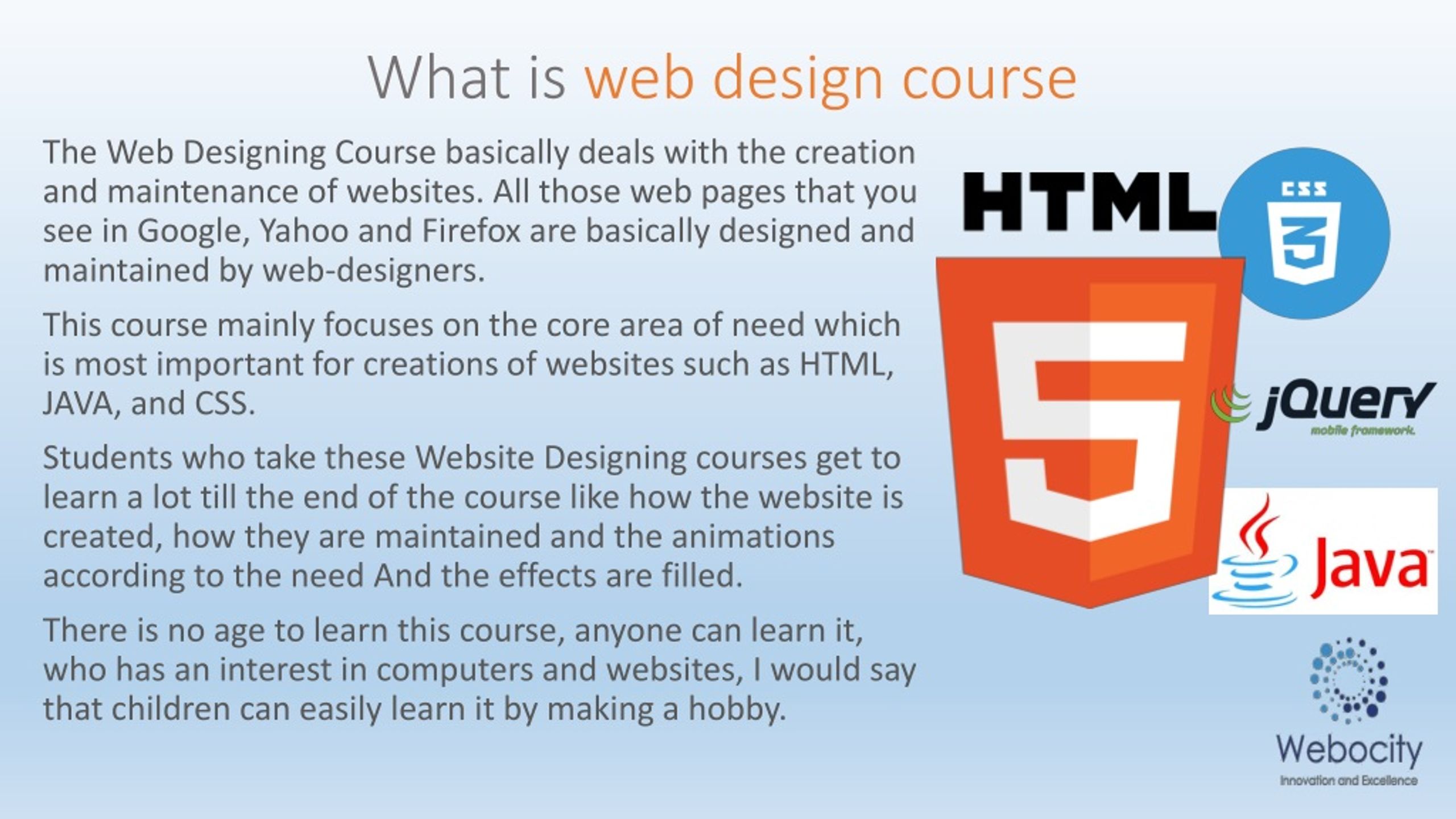 What is web design course The Web Designing Course basically deals with the creation and maintenance of websites. All those web pages that you see in Google, Yahoo and Firefox are basically designed and maintained by web-designers. This course mainly focuses on the core area of need which is most important for creations of websites such as HTML, JAVA, and CSS. Students who take these Website Designing courses get to learn a lot till the end of the course like how the website is created, how they are maintained and the animations according to the need And the effects are filled. There is no age to learn this course, anyone can learn it, who has an interest in computers and websites, I would say that children can easily learn it by making a hobby.