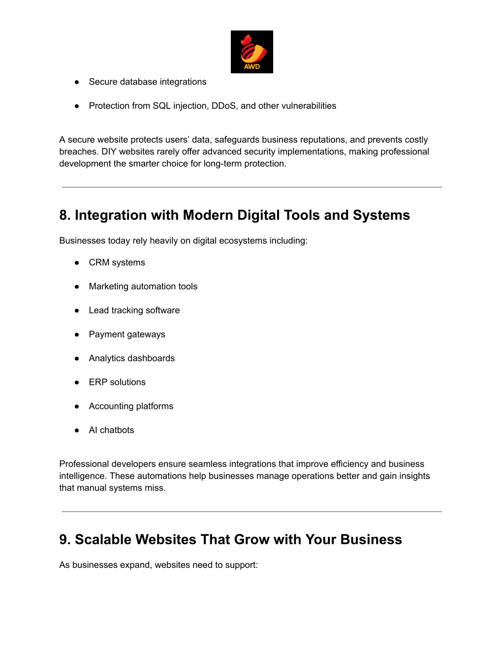 ● Secure database integrations ● Protection from SQL injection, DDoS, and other vulnerabilities A secure website protects users’ data, safeguards business reputations, and prevents costly breaches. DIY websites rarely offer advanced security implementations, making professional development the smarter choice for long-term protection. 8. Integration with Modern Digital Tools and Systems Businesses today rely heavily on digital ecosystems including: ● CRM systems ● Marketing automation tools ● Lead tracking software ● Payment gateways ● Analytics dashboards ● ERP solutions ● Accounting platforms ● AI chatbots Professional developers ensure seamless integrations that improve efficiency and business intelligence. These automations help businesses manage operations better and gain insights that manual systems miss. 9. Scalable Websites That Grow with Your Business As businesses expand, websites need to support: