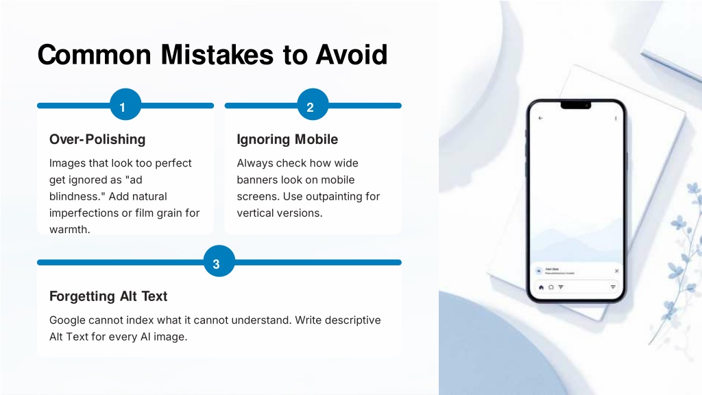 8. Common Mistakes to Avoid 1 2 Over-Polishing Ignoring Mobile Images that look too perfect get ignored as "ad blindness." Add natural imperfections or film grain for warmth. Always check how wide banners look on mobile screens. Use outpainting for vertical versions. 3 Forgetting Alt Text Google cannot index what it cannot understand. Write descriptive Alt Text for every AI image.