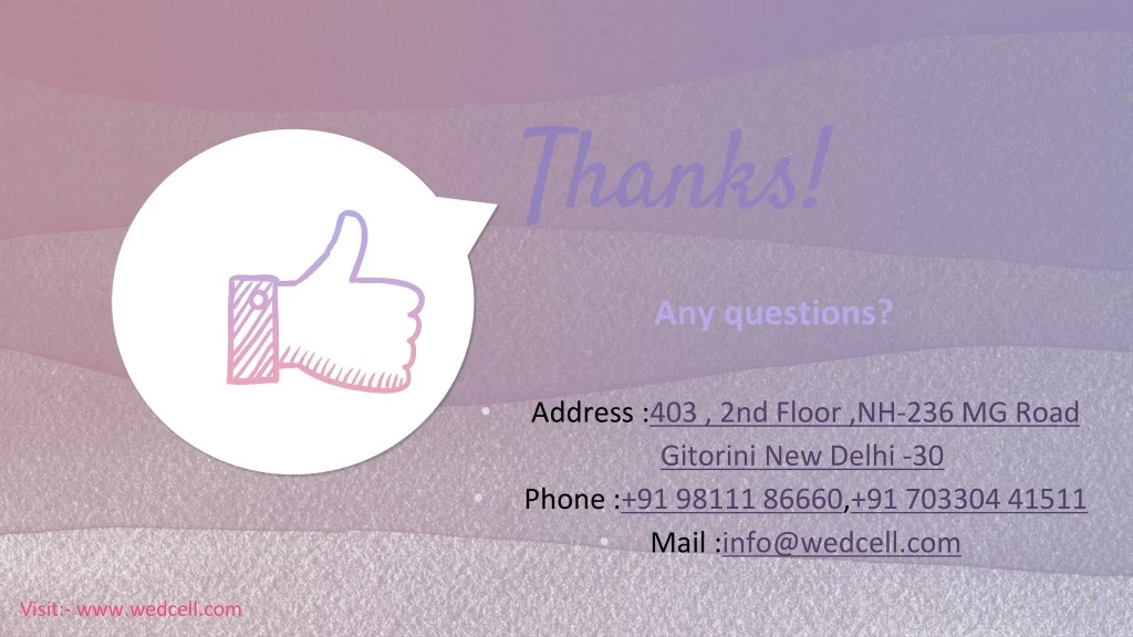 Thanks! Any questions? • Address :403 , 2nd Floor ,NH-236 MG Road Gitorini New Delhi -30 Phone :+91 98111 86660,+91 703304 41511 • Mail :info@wedcell.com • 5 Visit:- www.wedcell.com