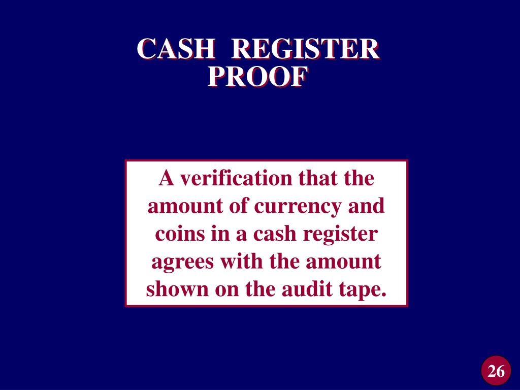 CASH REGISTER PROOF A verification that the amount of currency and coins in a cash register agrees with the amount shown on the audit tape. 26