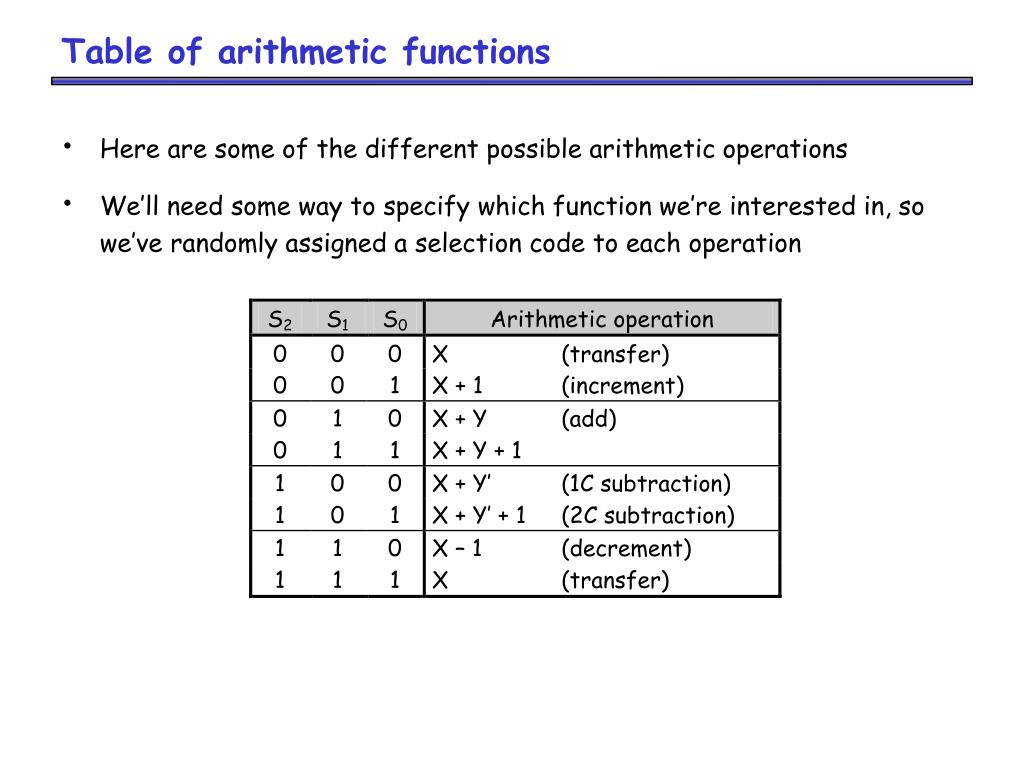 Table of arithmetic functions • Here are some of the different possible arithmetic operations • We’ll need some way to specify which function we’re interested in, so we’ve randomly assigned a selection code to each operation