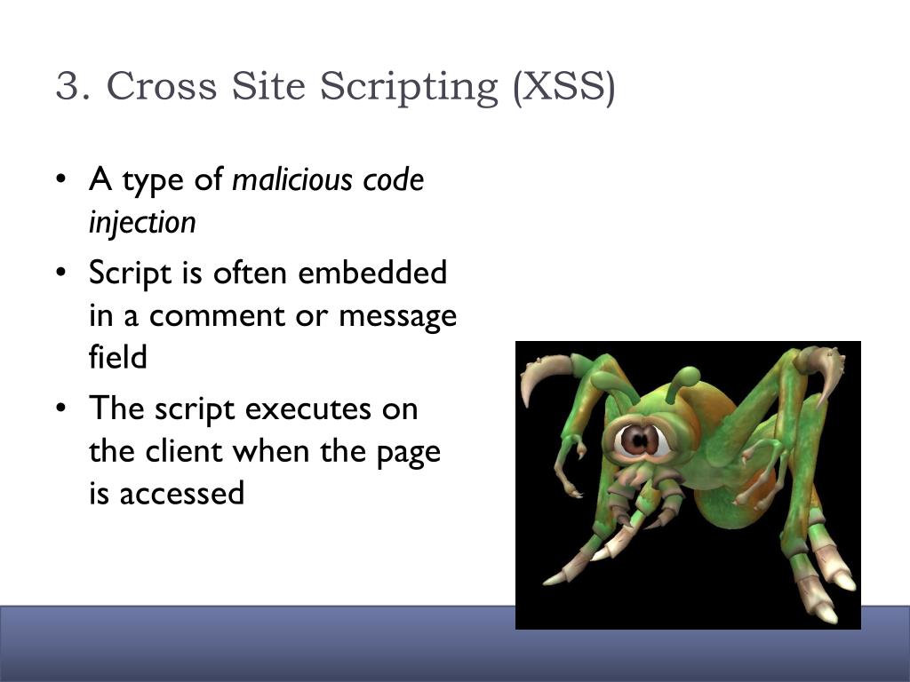 3. Cross Site Scripting (XSS) • A type of malicious code injection • Script is often embedded in a comment or message field • The script executes on the client when the page is accessed