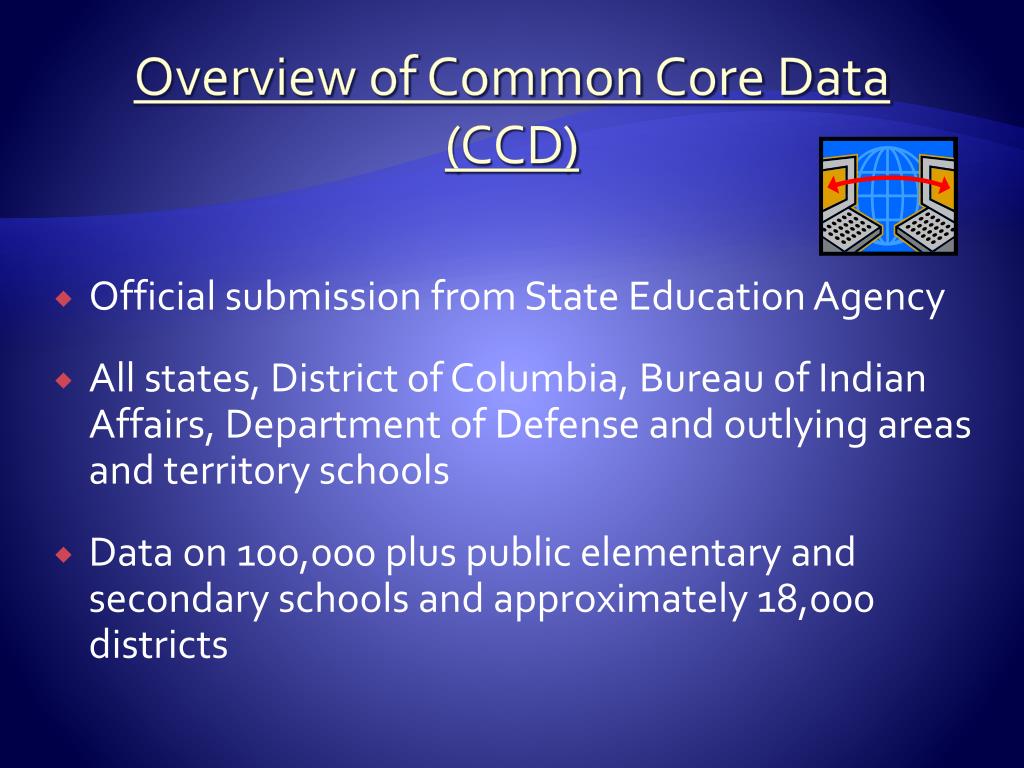 Overview of Common Core Data (CCD) • Official submission from State Education Agency • All states, District of Columbia, Bureau of Indian Affairs, Department of Defense and outlying areas and territory schools • Data on 100,000 plus public elementary and secondary schools and approximately 18,000 districts