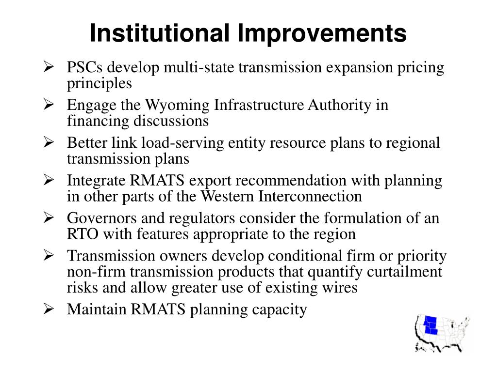 Institutional Improvements • PSCs develop multi-state transmission expansion pricing principles • Engage the Wyoming Infrastructure Authority in financing discussions • Better link load-serving entity resource plans to regional transmission plans • Integrate RMATS export recommendation with planning in other parts of the Western Interconnection • Governors and regulators consider the formulation of an RTO with features appropriate to the region • Transmission owners develop conditional firm or priority non-firm transmission products that quantify curtailment risks and allow greater use of existing wires • Maintain RMATS planning capacity
