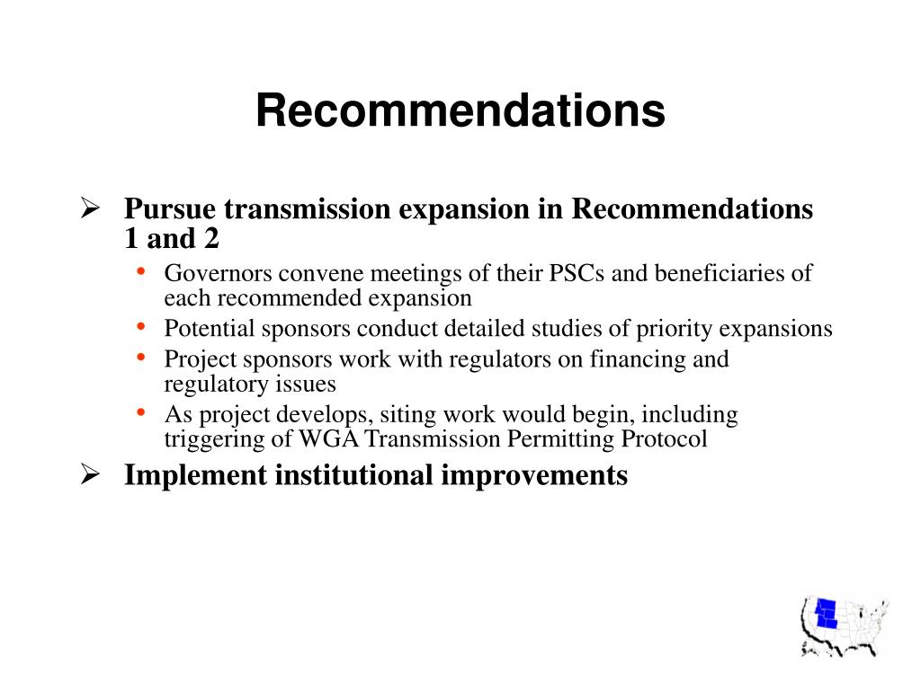 Recommendations • Pursue transmission expansion in Recommendations 1 and 2 • Governors convene meetings of their PSCs and beneficiaries of each recommended expansion • Potential sponsors conduct detailed studies of priority expansions • Project sponsors work with regulators on financing and regulatory issues • As project develops, siting work would begin, including triggering of WGA Transmission Permitting Protocol • Implement institutional improvements