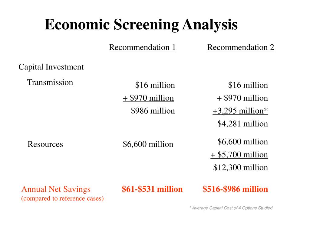 Economic Screening Analysis Recommendation 1 Recommendation 2 Capital Investment Transmission $16 million + $970 million $986 million $16 million + $970 million +3,295 million* $4,281 million Resources $6,600 million $6,600 million + $5,700 million $12,300 million Annual Net Savings(compared to reference cases) $61-$531 million $516-$986 million * Average Capital Cost of 4 Options Studied