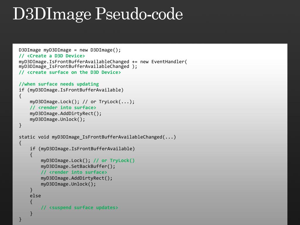 D3DImage Pseudo-code • D3DImage myD3DImage = new D3DImage(); • // <Create a D3D Device> • myD3DImage.IsFrontBufferAvailableChanged += new EventHandler( myD3DImage_IsFrontBufferAvailableChanged ); • // <create surface on the D3D Device> • //when surface needs updating • if (myD3DImage.IsFrontBufferAvailable) • { • myD3DImage.Lock(); // or TryLock(...); • // <render into surface> • myD3DImage.AddDirtyRect(); • myD3DImage.Unlock(); • } • static void myD3DImage_IsFrontBufferAvailableChanged(...) • { • if (myD3DImage.IsFrontBufferAvailable) • { • myD3DImage.Lock(); // or TryLock() • myD3DImage.SetBackBuffer(); • // <render into surface> • myD3DImage.AddDirtyRect(); • myD3DImage.Unlock(); • } • else • { • // <suspend surface updates> • } • }