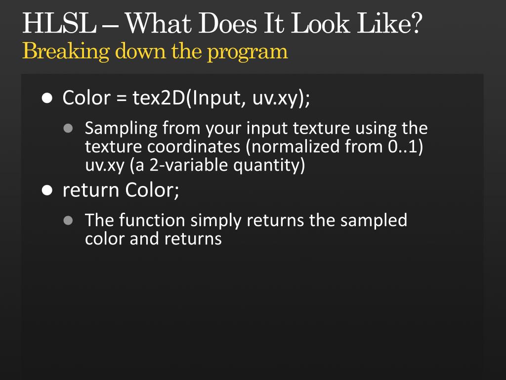 HLSL – What Does It Look Like?Breaking down the program • Color = tex2D(Input, uv.xy); • Sampling from your input texture using the texture coordinates (normalized from 0..1) uv.xy (a 2-variable quantity) • return Color; • The function simply returns the sampled color and returns