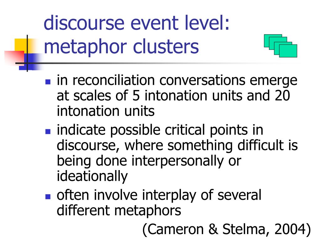 discourse event level: metaphor clusters • in reconciliation conversations emerge at scales of 5 intonation units and 20 intonation units • indicate possible critical points in discourse, where something difficult is being done interpersonally or ideationally • often involve interplay of several different metaphors (Cameron & Stelma, 2004)