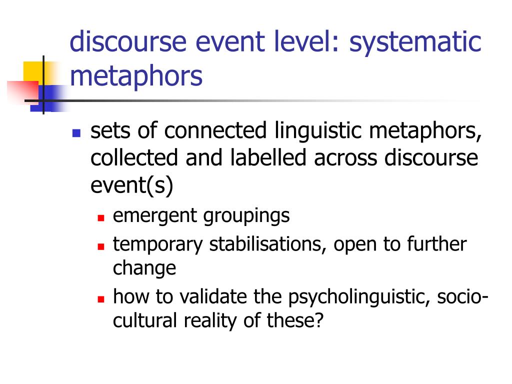 discourse event level: systematic metaphors • sets of connected linguistic metaphors, collected and labelled across discourse event(s) • emergent groupings • temporary stabilisations, open to further change • how to validate the psycholinguistic, socio-cultural reality of these?