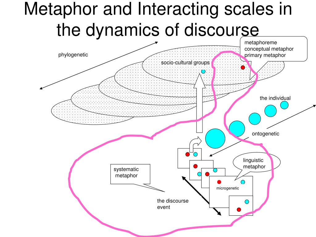 phylogenetic socio-cultural groups the individual ontogenetic linguistic metaphor systematic metaphor microgenetic the discourse event Metaphor and Interacting scales in the dynamics of discourse metaphoreme conceptual metaphor primary metaphor