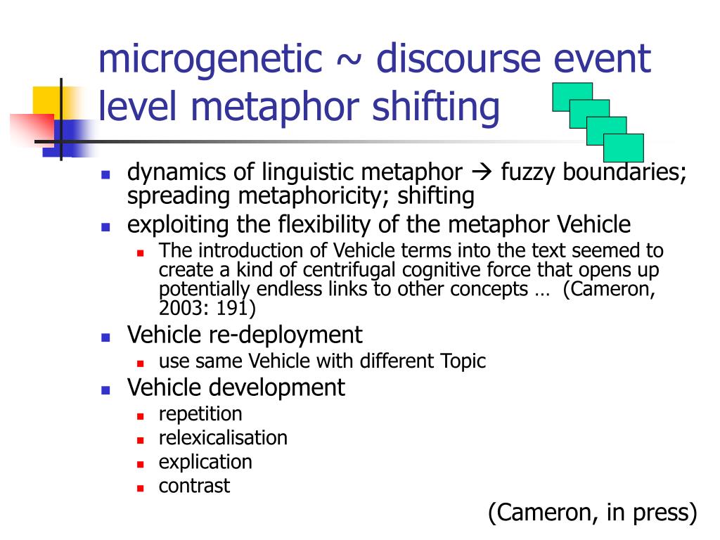 microgenetic ~ discourse event level metaphor shifting • dynamics of linguistic metaphor fuzzy boundaries; spreading metaphoricity; shifting • exploiting the flexibility of the metaphor Vehicle • The introduction of Vehicle terms into the text seemed to create a kind of centrifugal cognitive force that opens up potentially endless links to other concepts … (Cameron, 2003: 191) • Vehicle re-deployment • use same Vehicle with different Topic • Vehicle development • repetition • relexicalisation • explication • contrast (Cameron, in press)