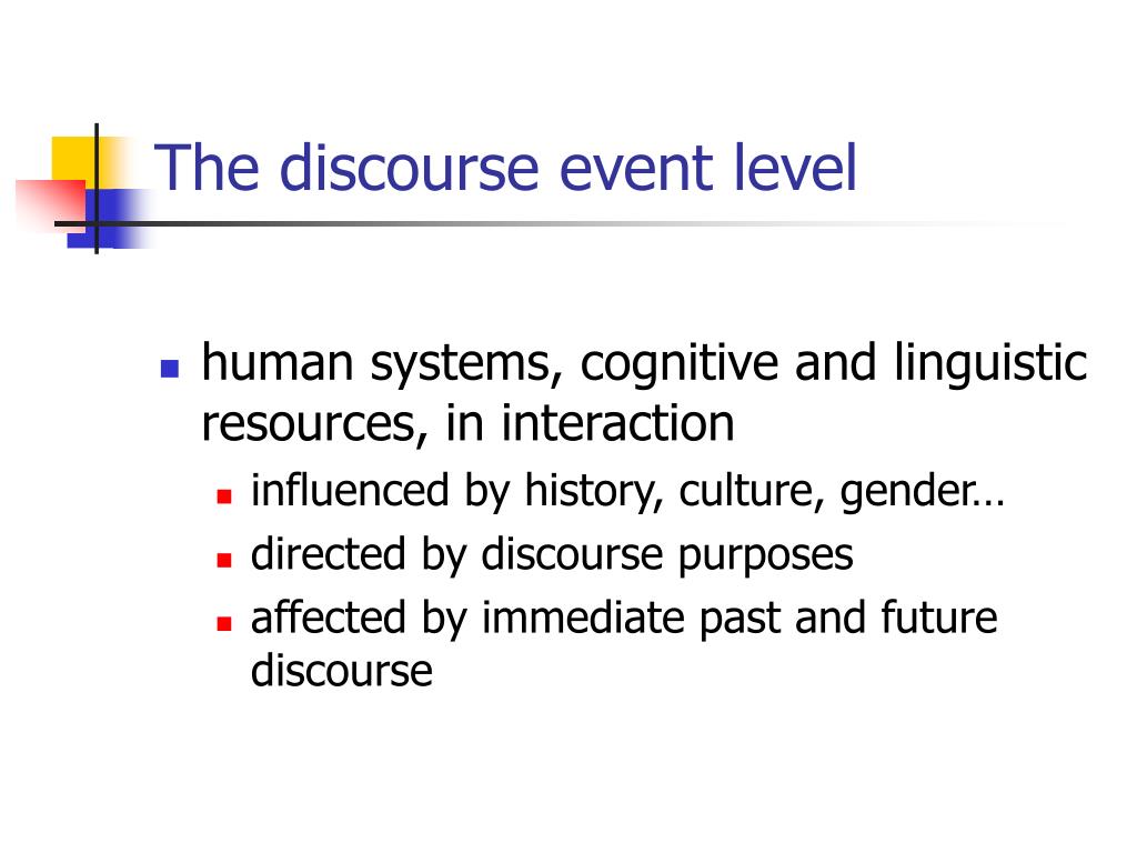 The discourse event level • human systems, cognitive and linguistic resources, in interaction • influenced by history, culture, gender… • directed by discourse purposes • affected by immediate past and future discourse