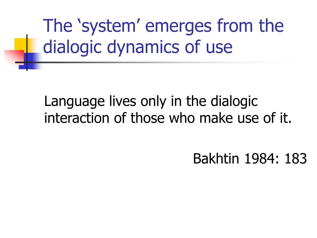 The ‘system’ emerges from the dialogic dynamics of use Language lives only in the dialogic interaction of those who make use of it. Bakhtin 1984: 183