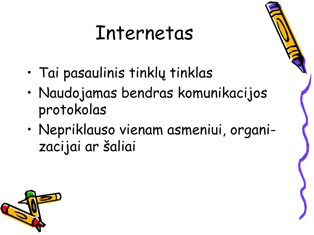 Internetas • Tai pasaulinis tinklų tinklas • Naudojamas bendras komunikacijos protokolas • Nepriklauso vienam asmeniui, organi-zacijai ar šaliai