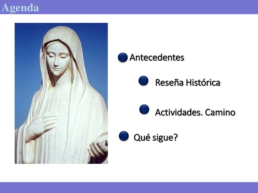REINA DE LA PAZ - ECUADOR-. Agenda. Antecedentes. Reseña Histórica. Actividades. Camino. Qué sigue ?. Antecedentes. Encuentro Personal con la Virgen que nos ha unido a todos de diferente forma, y que sentimos un llamado de la Santísima Virgen por medio de su presencia en Medjugorje.