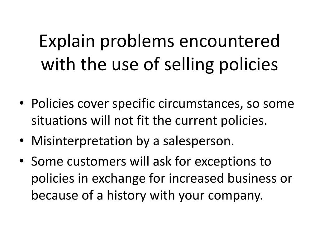 Explain problems encountered with the use of selling policies • Policies cover specific circumstances, so some situations will not fit the current policies. • Misinterpretation by a salesperson. • Some customers will ask for exceptions to policies in exchange for increased business or because of a history with your company.