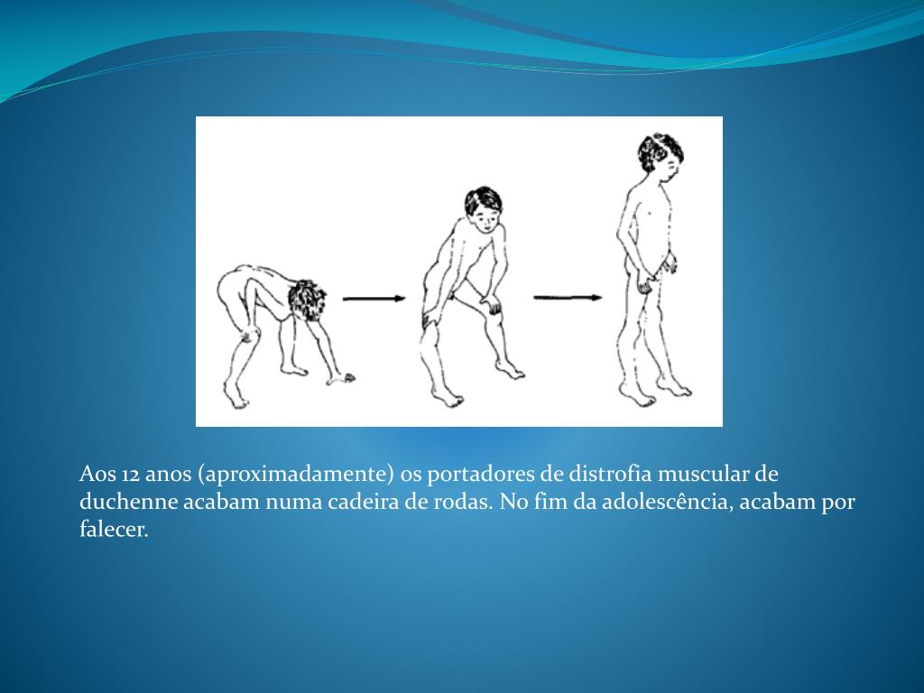 Aos 12 anos (aproximadamente) os portadores de distrofia muscular de duchenne acabam numa cadeira de rodas. No fim da adolescência, acabam por falecer.