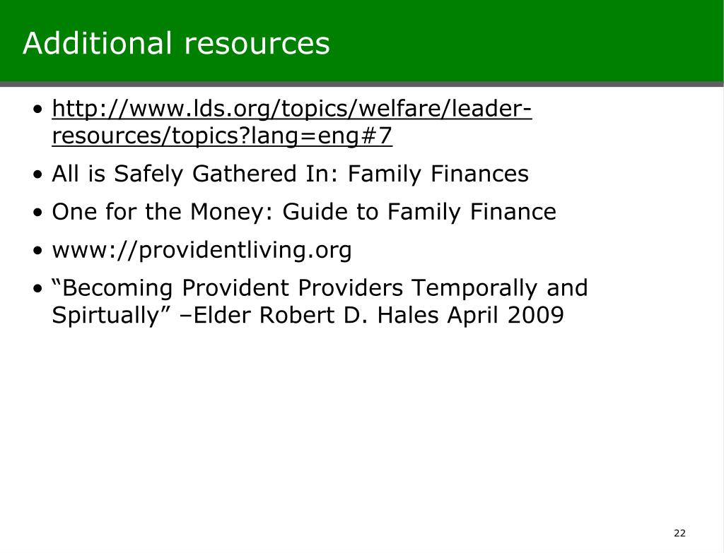Additional resources • http://www.lds.org/topics/welfare/leader-resources/topics?lang=eng#7 • All is Safely Gathered In: Family Finances • One for the Money: Guide to Family Finance • www://providentliving.org • “Becoming Provident Providers Temporally and Spirtually” –Elder Robert D. Hales April 2009