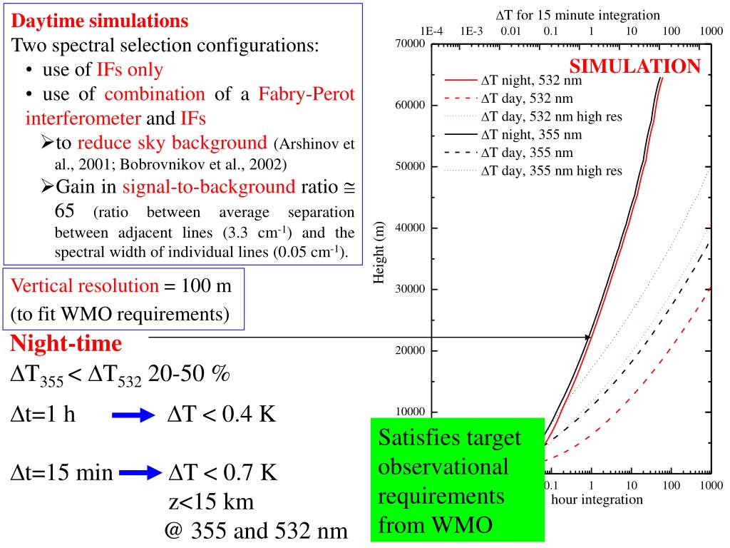 Daytime simulations • Two spectral selection configurations: • use of IFs only • use of combination of a Fabry-Perot interferometer and IFs • to reduce sky background(Arshinov et al., 2001; Bobrovnikov et al., 2002) • Gain in signal-to-background ratio @65 (ratio between average separation between adjacent lines (3.3 cm-1) and the spectral width of individual lines (0.05 cm-1). SIMULATION Vertical resolution = 100 m (to fit WMO requirements) Night-time DT355 < DT532 20-50 % Dt=1 h DT < 0.4 K Dt=15 min DT < 0.7 K z<15 km @ 355 and 532 nm Satisfies target observational requirements from WMO