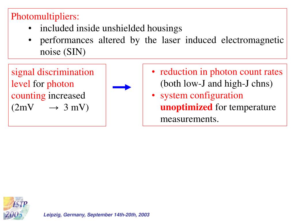 Photomultipliers: • included inside unshielded housings • performances altered by the laser induced electromagnetic noise (SIN) • reduction in photon count rates (both low-J and high-J chns) • system configuration unoptimized for temperature measurements. signal discrimination level for photon counting increased (2mV → 3 mV) Leipzig, Germany, September 14th-20th, 2003