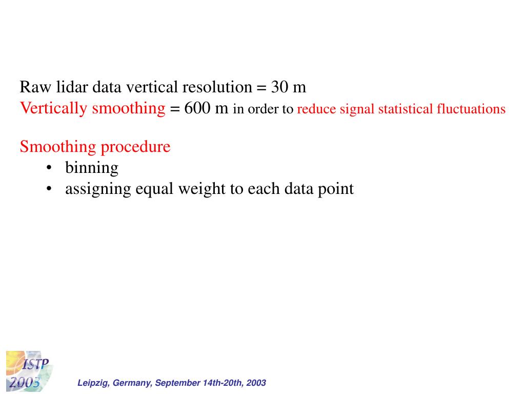 Raw lidar data vertical resolution = 30 m • Vertically smoothing = 600 m in order to reduce signal statistical fluctuations • Smoothing procedure • binning • assigning equal weight to each data point Leipzig, Germany, September 14th-20th, 2003