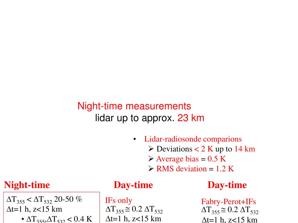 Night-time measurements • lidar up to approx. 23 km • Lidar-radiosonde comparions • Deviations < 2 K up to 14 km • Average bias = 0.5 K • RMS deviation = 1.2 K Night-time Day-time Day-time • DT355 < DT532 20-50 % • Dt=1 h, z<15 km • DT355,DT532 < 0.4 K • Dt=15 min, z<15 km • DT355,DT532 < 0.7 K IFs only Fabry-Perot+IFs DT355 @ 0.2 DT532 DT355 @ 0.2 DT532 Dt=1 h, z<15 km DT355 < 2.5 K Dt=1 h, z<15 km DT355 < 0.5 K