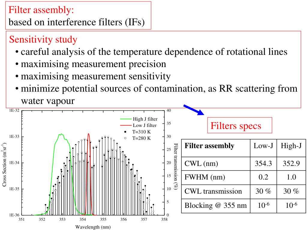 Filter assembly: based on interference filters (IFs) • Sensitivity study • careful analysis of the temperature dependence of rotational lines • maximising measurement precision • maximising measurement sensitivity • minimize potential sources of contamination, as RR scattering from water vapour Filters specs
