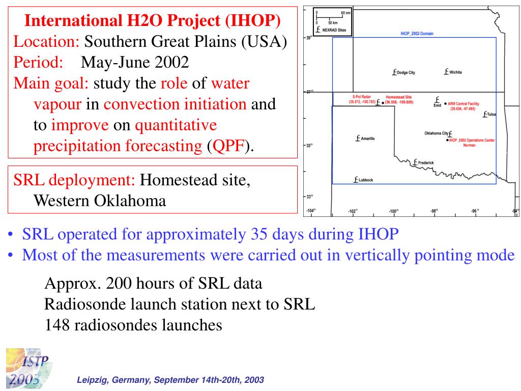 International H2O Project (IHOP) Location: Southern Great Plains (USA) Period: May-June 2002 Main goal: study the role of water vapour in convection initiation and to improve on quantitative precipitation forecasting (QPF). SRL deployment: Homestead site, Western Oklahoma • SRL operated for approximately 35 days during IHOP • Most of the measurements were carried out in vertically pointing mode Leipzig, Germany, September 14th-20th, 2003