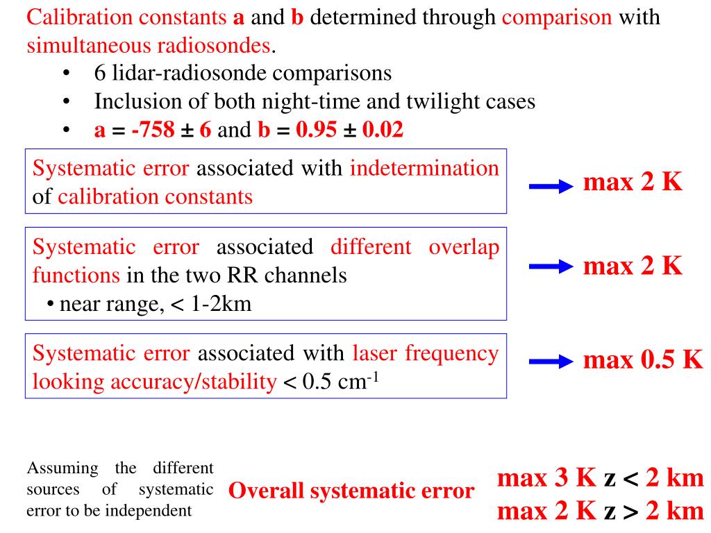 Calibration constantsa and b determined through comparison with simultaneous radiosondes. • 6 lidar-radiosonde comparisons • Inclusion of both night-time and twilight cases • a = -758 ± 6 andb = 0.95 ± 0.02 Systematic error associated with indetermination of calibration constants max 2 K • Systematic error associated different overlap functions in the two RR channels • near range, < 1-2km max 2 K Systematic error associated with laser frequency looking accuracy/stability < 0.5 cm-1 max 0.5 K Assuming the different sources of systematic error to be independent max 3 K z < 2 km max 2 K z > 2 km Overall systematic error